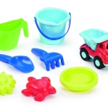 Súčasťou súpravy je vedierko s priemerom 10 cm, sitko, hrabličky, lopatka, dve formičky a autíčko – sklápač pre ešte zábavnejšiu hru. Rozmery vozíka 69,5 × 20 × 20,5 cm (vrátane držadla) uľahčia manipuláciu aj deťom. Súpravu po hre jednoducho opláchnete vodou a je pripravená na ďalšie dobrodružstvá.