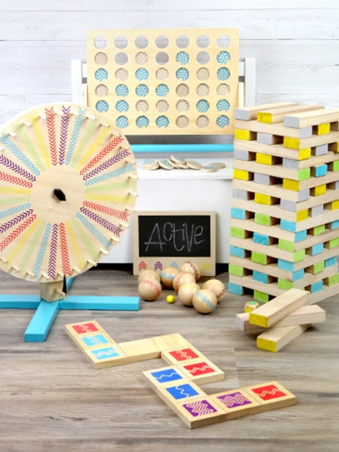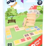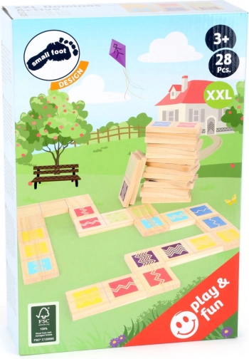 Domino XXL Active od small foot je nadčasová spoločenská hra v maxi vyhotovení, ktorá zabaví deti aj dospelých. Každý dielik je vyrobený zo 100 % FSC certifikovaného dreva a zdobený výraznými farbami aj šrafovanými vzormi. Hrať môžete podľa farieb aj podľa šrafovania – deti si tak trénujú zrakové rozlišovanie, sústredenie a strategické myslenie.