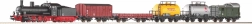 Parná lokomotíva BR 55 s tendrom, 5× nákladný vozeň, 12× oblúk R2 s podložím (55412), 5× rovná G231 s podložím (55401), 1× rovná G231 s pripojením napájania (55406), podložka pre svorku (55447), napájacia svorka (55270), základný analógový ovládač s napájacím zdrojom (55003)