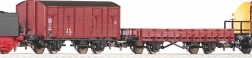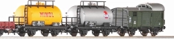 Súprava zahŕňa zmes nákladných vozňov DB éry III – krytý vozeň, plošinový vozeň a cisterny – pre variabilné zostavy a realistické nákladné scenáre na vašej trati.