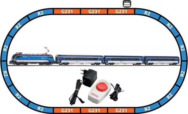 - Obsah sady: elektrická lokomotíva ČD Taurus (1×), osobný vozeň 2. triedy ČD (3×), oblúkové koľaje R2 s podložím (12×), rovné koľaje G231 s podložím (5× + 1× s napájacím pripojením), napájacia svorka s podložím, základný analógový ovládač s napájacím zdrojom.
