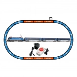 Súčasťou je lokomotíva, tri vozne, kompletný ovál koľají a analógový ovládač – po zostavení jazdíte okamžite. Odporúčaná minimálna konštrukčná plocha je 168 × 98 cm.