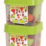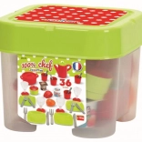 Kompletný jedálenský set v boxe pre malých kuchárov obsahuje všetko potrebné na servírovanie pohostenia. Nájdete v ňom taniere, príbory, poháriky, hrnčeky, kanvičku s vrchnákom, hrniec s pokrievkou a tiež ovocie a jogurt. Skvelá voľba na rozvoj fantázie, role-play a jemnej motoriky.