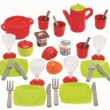 Set zahŕňa realistické doplnky, ktoré podporujú rozvoj sociálnych zručností a fantázie. Od tanierov a príborov cez hrnčeky a poháriky až po kanvičku s vrchnákom a hrniec s pokrievkou – všetko je navrhnuté pre bezpečnú detskú hru.