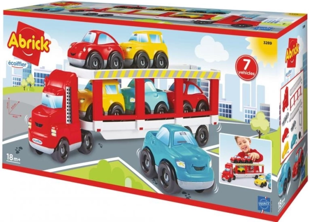 Atraktívny Abrick prepravník na prepravu autíčok! Prepravník je vybavený sklopnou rampou, ktorá umožňuje jednoduché nakladanie a vykladanie šiestich farebných autíčok.