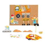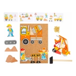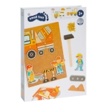 Táto kreatívna zatĺkacia sada na korkovej doske je skvelou voľbou pre malých staviteľov a milovníkov dopravy. Deti si môžu z drevených tvarov vytvoriť pracovníkov, miešačku, žeriav alebo autá a pomocou pripináčikov ich bezpečne pripevniť ku korkovej tabuli. Praktický úložný box zaistí, že sa žiadny dielik nestratí.
