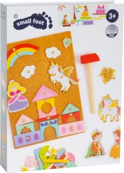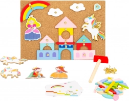 Zatlĺkacia hra Jednorožec je čarovná hračka, ktorá rozvíja kreativitu a jemnú motoriku vašich detí. Balenie obsahuje korkovú dosku, kladivo, pripináčiky a drevené objekty rôznych tvarov ako princezná a jednorožec.