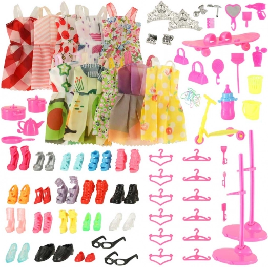Tento megaset obsahuje úplne 85 prvkov, vrátane 10 farebných sukničiek a mnohých ďalších atraktívnych doplnkov, ako sú topánky či korunky. Navyše je tu niekoľko malých stojanov a ramienok pre jednoduchú organizáciu šatníka bábik.