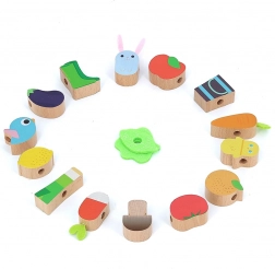 Sada 14 ilustrovaných korálikov (napr. baklažán, paradajka, vtáčik, gumené čižmy) podporuje fantáziu, učenie farieb a pomenovávanie.