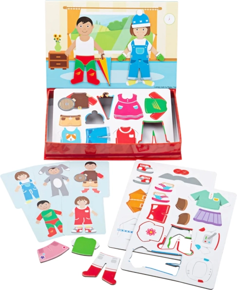 Podporte detskú kreativitu s novým magnetickým puzzle Šaty od Bigjigs Toys. Deti môžu obliekať dvojicu postavičiek pomocou magnetických obrázkových dielikov, čo umožňuje neobmedzenú kreatívnu hru a rozprávanie príbehov.