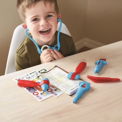 Lekárska súprava pre deti od Green Toys obsahuje všetko, čo malí lekári potrebujú na hru a učenie. S pomocou šiestich nástrojov, ako sú stetoskop, teplomer alebo otoskop, môžu deti napodobňovať lekárske postupy, čo pomáha rozvíjať ich kreativitu, sociálne a jazykové zručnosti. Vďaka recyklovanému plastu je táto hračka ideálnou voľbou pre rodičov, ktorí kladú dôraz na ochranu životného prostredia.