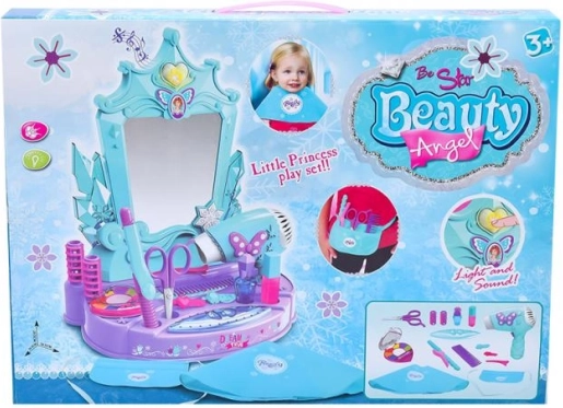 Tento štýlový toaletný set v tyrkysovo‑fialovej farebnej kombinácii prináša deťom hodiny tvorivej zábavy. Hlavnou dominantou je zrkadlo so svetelnými a zvukovými efektmi – po aktivácii spustí melódie, ktoré umocnia atmosféru pri hre na kadernícky či kozmetický salón.