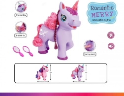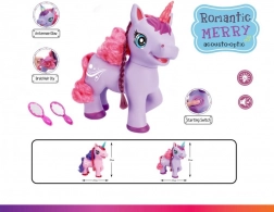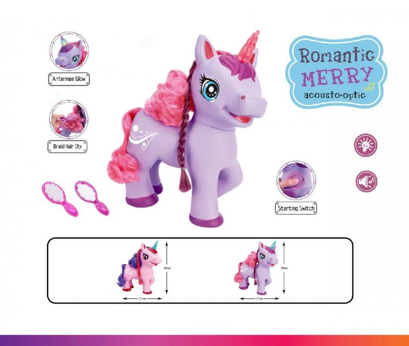Roztomilý fialový jednorožec na batérie poteší deti svojimi efektmi – po stlačení tlačidla na brušku začne spievať anglickú pesničku, vydáva magické zvuky a jeho roh svieti. Súčasťou je hrebeň a zrkadielko na česanie dlhej hrivy.