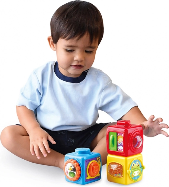Deti sa môžu učiť a hrať súčasne vďaka otočným a pohyblivým prvkom kociek, ktoré podporujú rozvoj ich motorických schopností.