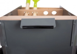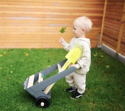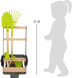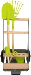 Tento záhradný vozík umožňuje mladým záhradníkom pracovať na svojom vysnívanom záhone. Stabilný vozík z bukového dreva a kovu sa dá ľahko tlačiť alebo ťahať po záhrade, pretože je vybavený pevnými kolesami. Obsahuje 5 kusov náradia na bezpečné a zábavné záhradníčenie.
