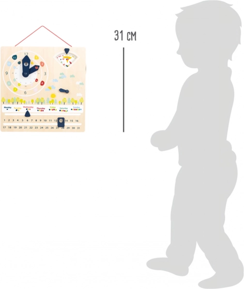 Prehľadná drevená tabuľa kombinuje hodiny, kalendár a ukazovatele počasia. Farebné prvky a jasné piktogramy uľahčujú pochopenie a podporujú zábavné učenie každý deň.