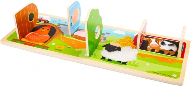Senzorické puzzle s farmárskym motívom prináša deťom bohatý svet tvarov, farieb a textúr. Otváracie vrátka a hmatové prvky nabádajú k objavovaniu, kladeniu otázok a rozprávaniu príbehov. Deti si hravou formou precvičia poznávanie zvierat, vizuálne vnímanie aj dotykové zručnosti.