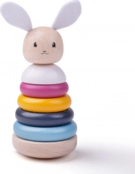 Táto kvalitná drevená nasadzovačka v pastelových farbách je ideálna prvá vzdelávacia hračka. Deti skladajú krúžky od najväčšieho po najmenší, posilňujú koordináciu oko–ruka a učia sa rozlišovať farby aj tvary. Textilné ušká a chvostík zajačika pridávajú hmatový rozmer hry.