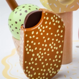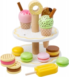 Tento kvalitný drevený stojan na sladkosti prináša hodiny nápaditej hry. Deti môžu vyberať z makróniek, zmrzlín a nanukov, aranžovať ich na poschodový podnos a „obsluhovať“ kamarátov aj rodičov. Robustné spracovanie a jemné farby lákajú k opakovanému hraniu a rozvíjajú detskú tvorivosť.