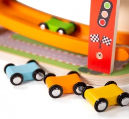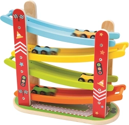 Obsahuje štyri farebné autíčka, ktoré sa spustia dolu po rampách, pričom každé z nich ponúka jedinečný farebný spôsob, ako zabaviť a vzdelávať deti. Rozvíja motoriku a koordináciu očí s rukami prostredníctvom zábavnej hry.