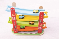 Hračka podporuje rozvoj jemnej motoriky a koordináciu rúk a očí, keď deti sledujú, ako autíčka schádzajú po naklonených dráhach.