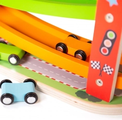 Drevená dráha ponúka viacúrovňové trasy v živých farbách ako modrá, červená, žltá a zelená, ktoré určite zaujmú každé dieťa.