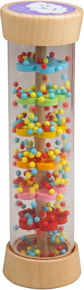 Dažďový valec Bigjigs Baby je zmyslová hračka, ktorá deti zaujme svojím upokojujúcim šumom a pestrými farbami. Vo vnútri priehľadného valca putujú guľôčky cez farebné disky, čím napodobňujú jemný dážď. Obe čelá zdobia roztomilé motívy slnka a obláčika, ktoré podporujú vizuálne vnímanie.