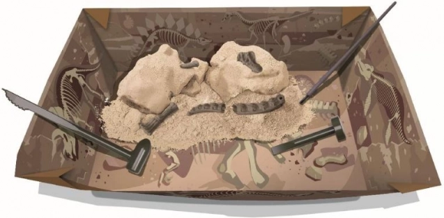 Sádrový blok skrýva časti kostry, ktoré deti postupne odhalia pomocou priložených nástrojov – ako na ozajstnej archeologickej expedícii.