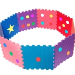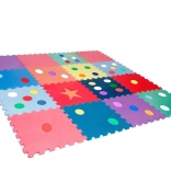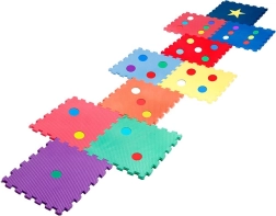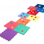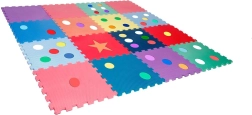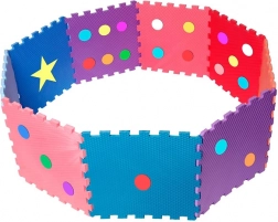 Živé farby a tvary (bodky, hviezda) podporujú zmyslové vnímanie a rozvoj jemnej aj hrubej motoriky. Pena tlmí nárazy a chráni pred chladom podlahy.