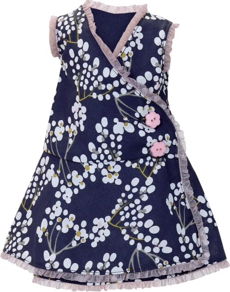 Tmavomodré šaty s kvetinovou potlačou, V výstrihom, ozdobným lemovaním a ružovými gombíčkami dodajú bábike šmrnc a eleganciu.