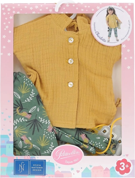 Elegantná sada oblečenia pre bábiky PETITCOLLIN radu Finouche vo veľkosti 48 cm. Obsahuje okrovú blúzku, zelené nohavice s tropickým vzorom, štýlovú tašku a ladiacu čelenku. Kvalitné spracovanie, francúzska elegancia a nezameniteľný dizajn potešia každú malú stylistku.