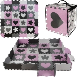 Podložku možno zostaviť na plocho (cca 140 × 140 cm) alebo vytvoriť ohrádku pomocou bočných líšt a rohov. Materiál EVA je vodoodolný a ľahko sa čistí – stačí utrieť vlhkou handričkou. Sada je dodávaná v praktickom prenosenom puzdre, takže ju ľahko vezmete na návštevu alebo upracete, keď sa práve nepoužíva.