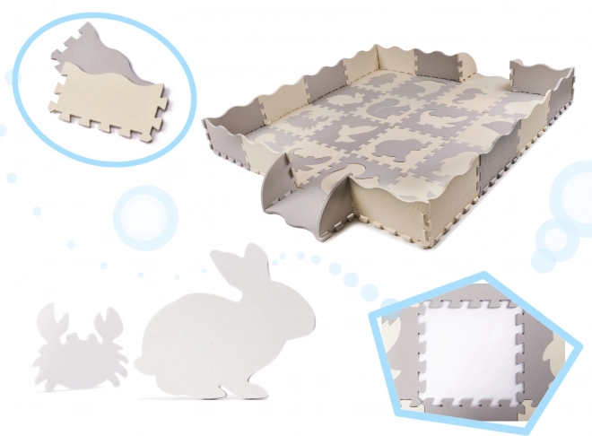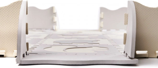Mäkká detská podložka z penových puzzle s vyberateľnými tvarmi vytvára bezpečný a kreatívny priestor na hru. Vďaka zvýšeným okrajom možno zostaviť ohrádku, ktorá udrží hračky vo vnútri. Podložka je vodoodolná, má protišmykový povrch a výborne tlmí nárazy, takže je ideálna pre prvé krôčiky. Neutrálna sivá a ecru farba zapadne do každého interiéru.