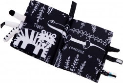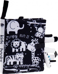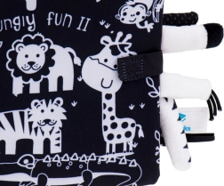 Prvá knižka pre bábätko, ktorá rozvíja zmysly a fantáziu. Ľahká textilná knižka v čierno‑bielom kontrastnom prevedení s motívmi safari a vystúpenými chvostíkmi zvieratiek podporuje zrakovú stimuláciu, jemnú motoriku a koordináciu oko–ruka. Šuštiace stránky, rôzne textúry a anglické názvy zvierat zaujmú už od narodenia.