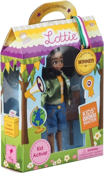 Lottie Aktivistka Meg je malá, no odvážna hrdinka, ktorá inšpiruje deti k sebavedomiu a vyjadrovaniu vlastných názorov. Jej outfit odkazuje na občiansku angažovanosť – žlté tričko s nápisom „Kids Voices Matter“, zelená bunda s plackou „Stand Up“, džínsové šortky a biele tenisky.