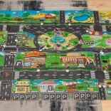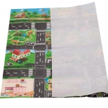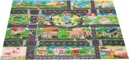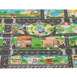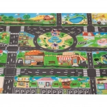 Podložka znázorňuje mestskú krajinu s cestami, budovami a parkami, čo podporuje detskú predstavivosť a kreativitu pri hre s hračkami.