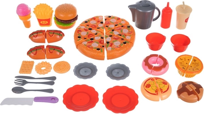 Súprava hračiek na rýchle občerstvenie je perfektná pre malých kuchárov a kuchárky, ktorí si chcú hrať na prípravu obľúbených jedál. Deti môžu tvoriť vlastné kombinácie vďaka 42 prvkom, ktoré táto súprava obsahuje. Hravé farby a realistický dizajn jednotlivých častí pôsobia veľmi vierohodne a podnecujú detskú predstavivosť.