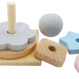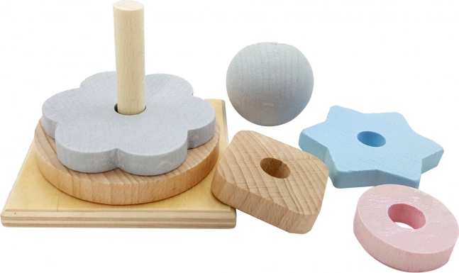 Klasická hračka s piatimi stohovacími tvarmi a drevenou guľou, ktorá je ideálna pre malé detské rúčky. Vďaka svojmu tvaru je ľahko uchopiteľná a pomáha rozvíjať koordináciu a jemnú motoriku rúk.