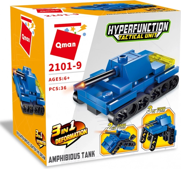 Stavebnica Tank Qman 3v1 ponúka trojicu možností zostavenia z pestrých plastových kociek, ktoré je možné kombinovať s podobnými stavebnicami. Vyrobené z kvalitného a odolného ABS plastu.