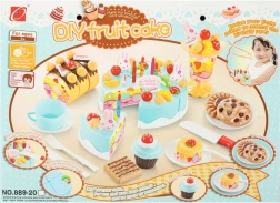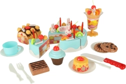 - Obsah sady (75 ks): 6× diel torty, 5× sviečka, 14× pusinka (bezé), 7× cukrová tyčinka, 4× čerešnička, 4× mandarínka, 3× jahoda, 3× kiwi, 4× zajačik, 1× nápis, 3× tanierik, 3× sušienka, 3× kúsok rolády, 3× cupcake, 1× šálka, 1× lyžička, 1× vidlička, 1× nožík, 1× lopatka na tortu, 1× pohár na zmrzlinu, sada samolepiek, sada suchých zipsov.