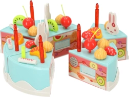 Rozžiarte detskú oslavu touto modrou narodeninovou tortou na krájanie – 75-dielna sada plná ovocia, sviečok a doplnkov na hru na cukrára. Vďaka spojom na suchý zips deti tortu ľahko rozkroja a znova zložia, zdobia podľa fantázie a trénujú jemnú motoriku aj sociálne zručnosti. Vyrobené z bezpečného ABS plastu, vhodné od 3 rokov.