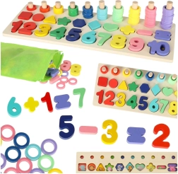 Táto montessori sada spája radosť zo skladania s učením. Deti priraďujú drevené geometrické tvary a čísla do správnych otvorov a zároveň na kolíky navliekajú farebné krúžky, ktorých počet zodpovedá danej číslici. Vďaka prehľadnej drevenej základni je učenie prirodzené a zábavné.