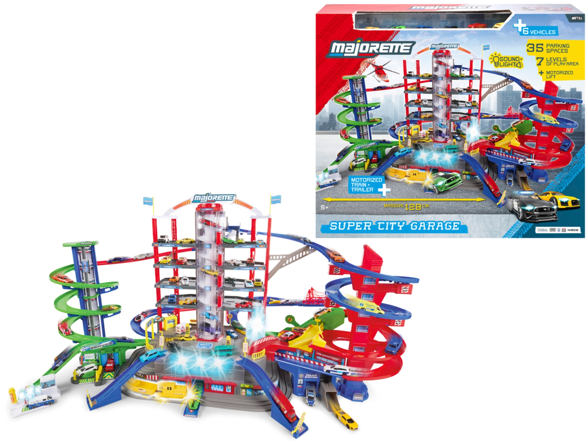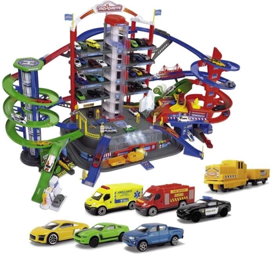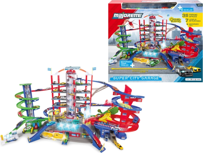 Objavte megaset pre malých vodičov: 7-poschodový garážový komplex Super City s výťahom, špirálovými rampami a 6 kovovými autíčkami doplnenými o lokomotívu so svetelnými a zvukovými efektmi. Nechýba heliport, stanica polície a hasičov, umývačka ani čerpacia stanica so zvukmi a svetlami – všetko pre maximálnu porciu akčnej a kreatívnej hry.