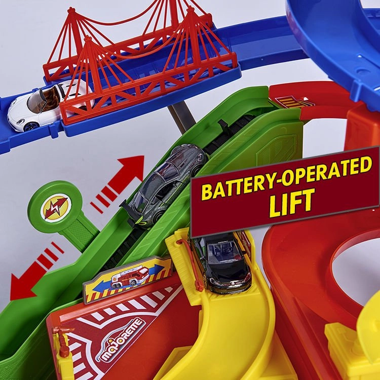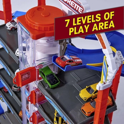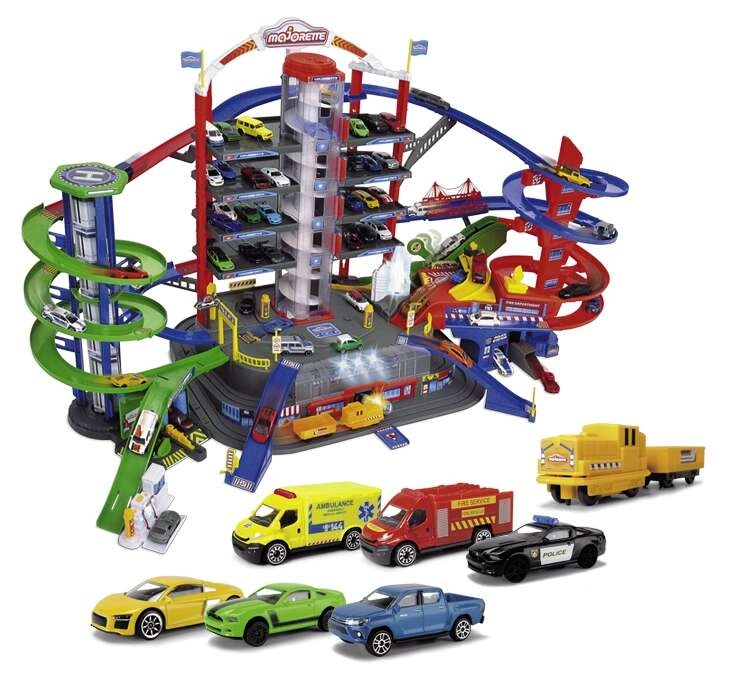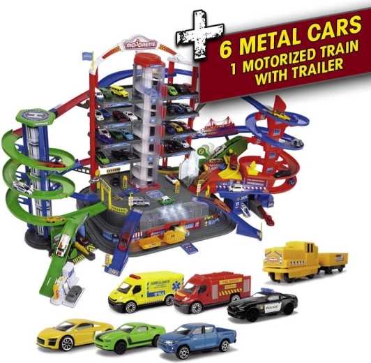 Tento veľký garážový set prináša deťom nekonečné možnosti hry na ploche siedmich poschodí. Farebné špirálové dráhy, batériou poháňaný výťah a realistické svetelné a zvukové efekty vtiahnu do deja každého malého nadšenca áut a vlakov. Kovové autíčka s voľne sa otáčajúcimi kolieskami jazdia hladko po rampách, zatiaľ čo lokomotíva s vagónom prechádza tajným tunelom a zastavuje na vlakovej stanici.