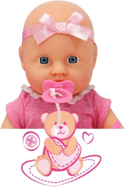 Bábika je oblečená v ružových šatách s potlačou medveďa a mašličkou. Je obľúbeným spoločníkom na každý deň.