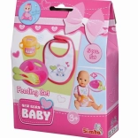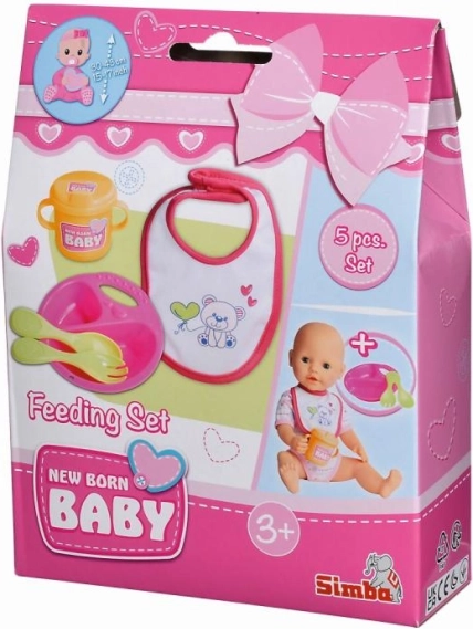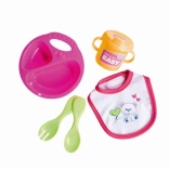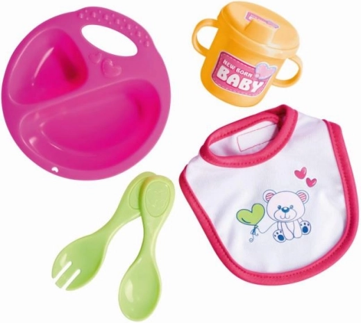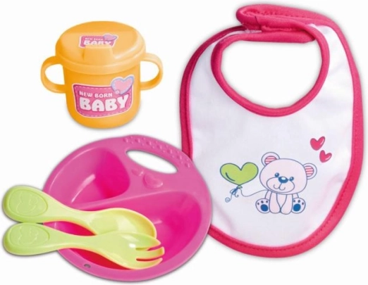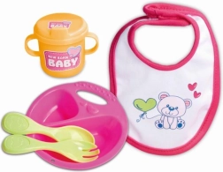 Roztomilá jedálenská sada pre bábiky NEW BORN BABY obsahuje 5 dielov – tanier, lyžičku, vidličku, hrnček a podbradník – pre bábiky 30–43 cm. Ľahká a ľahko umývateľná sada je ideálna na hru na kŕmenie a rozvoj jemnej motoriky.