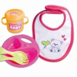 Tanier, lyžička, vidlička, hrnček s uškami a textilný podbradník – všetko v jednom balení pre realistické kŕmenie bábiky.