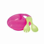 Ľahké plastové riady so zaoblenými tvarmi a ergonomickými príbormi podporujú samostatnú hru a jemnú motoriku.