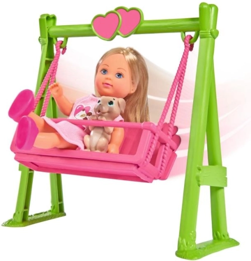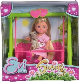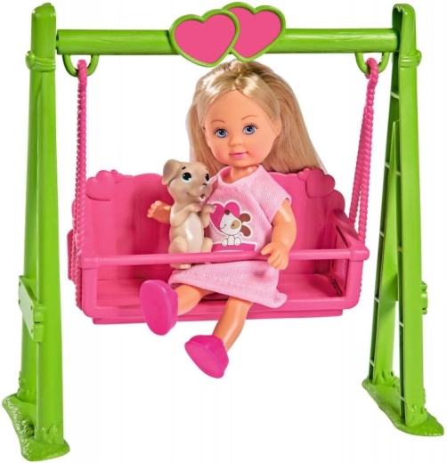 Objavte čaro hry s bábikou Evičkou, ktorá si užíva zábavu na farebnej hojdačke a má po boku svoje milované zvieratko. Tento rozkošný set podporuje kreatívnu a imaginatívnu hru, poteší živými farbami a je ideálny pre malé deti vďaka kompaktnej veľkosti bábiky 12 cm.