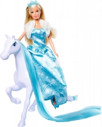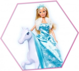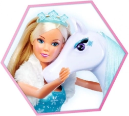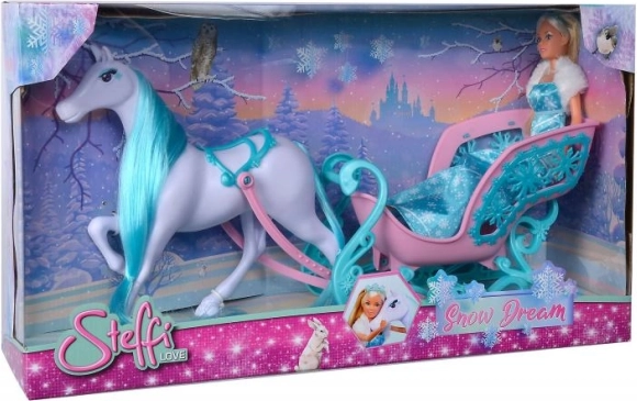 Vyberte sa na kúzelnú cestu so setom bábiky Steffi ako ľadovej princeznej. Tento krásny set obsahuje bieleho koňa s dlhou tyrkysovou hrivou a ružovými, zdobenými sánkami pre dokonalú zimnú atmosféru. Bábika Steffi je oblečená do modrých šiat s motívom vločiek a s korunou na hlave, pripravená na dobrodružstvo v zimnom kráľovstve.